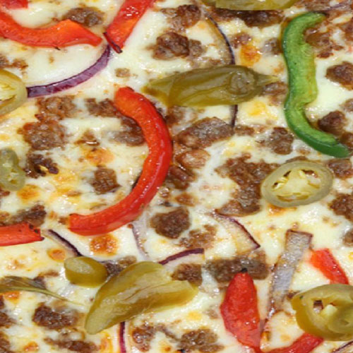 Tomato sauce, mozzarella cheese, onions, jalapenos, mix peppers, fresh tomatoes and beef