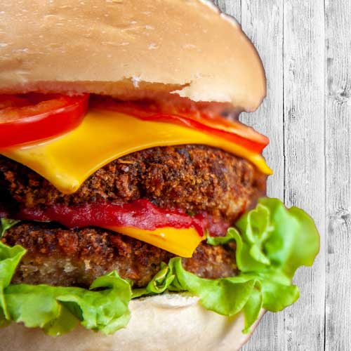 175g of homemade beef, seasoned to perfection topped with mozzarella cheese, sliced cheddar cheese, lettuce, pickled cucumber & tomatoes