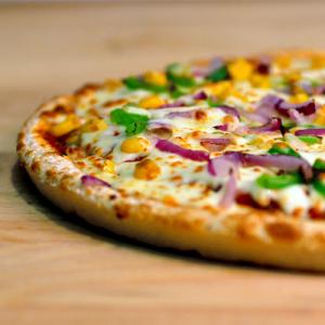 Onions, green peppers, fresh tomatoes, sweetcorn and mushrooms.