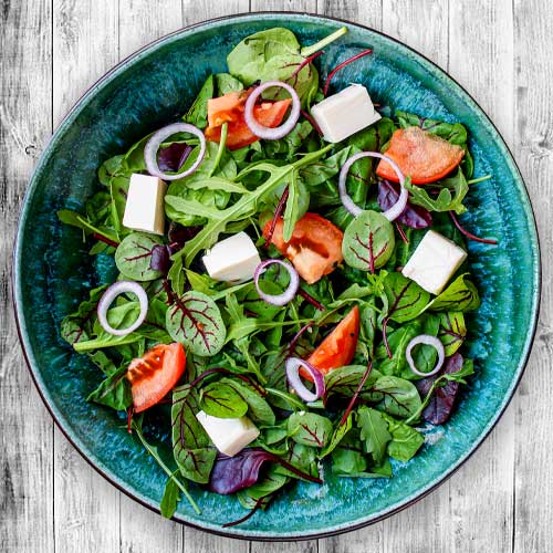 Lettuce, cucumber, green peppers, black olives, onions, feta cheese French dressing and sliced tomatoes with herbs.