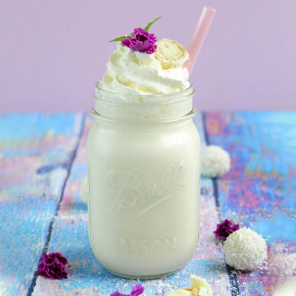 A fresh topped with white chocolate crepe sauce and pieces of luxury raffaello, coconut shavings served with a scoop of kellys vanilla bean ice cream.