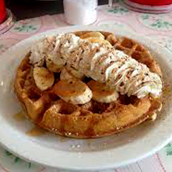 A fresh golden waffle drizzled with toffee spread with sliced bananas topped with caramel sauce served with a scoop of kellys vanilla bean ice cream.