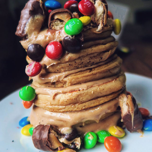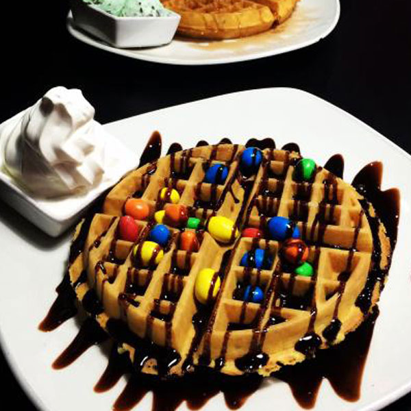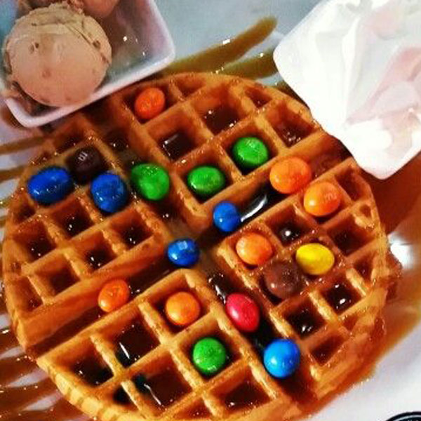 A fresh golden waffle drizzled with milk chocolate saucetopped with peanut m and m pieces and finished with morechocolate sauce with a scoop of kellys vanilla bean ice cream