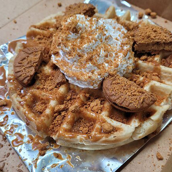A fresh golden waffle with lotus biscoff spread, crushed lotus biscuits and drizzled in lotus biscoff sauce served with a scoop of kellys vanilla bean ice cream