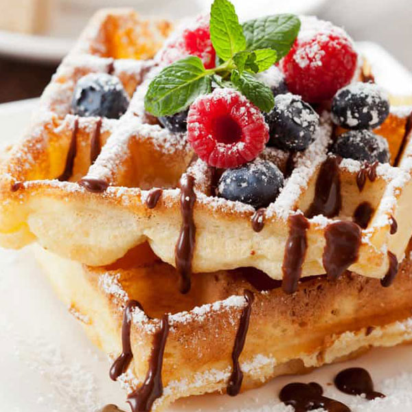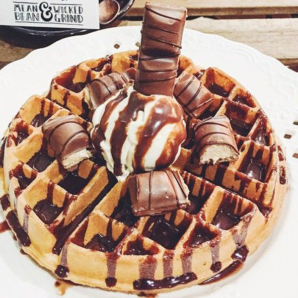 A fresh golden waffle drizzled with milk chocolate saucetopped with smarties and more smarties and finished withchocolate sauce with a scoop of kellys vanilla bean ice cream