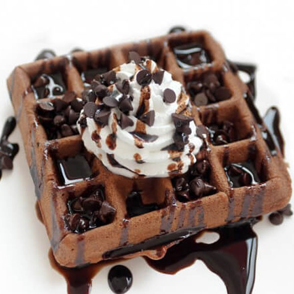 A fresh golden waffle drizzled with milk chocolate saucetopped with warm brownie chunks and a second helpingof choc. Sauce with a scoop of kellys vanilla bean ice cream.