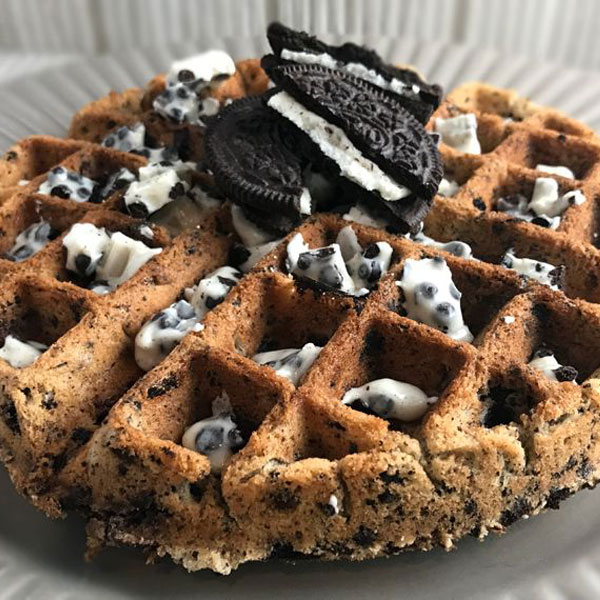 An explosion of oreo crumbles drizzled with white chocolate on a fresh golden waffle served with a scoop of kellys vanilla bean ice cream topped with chocolate sauce.