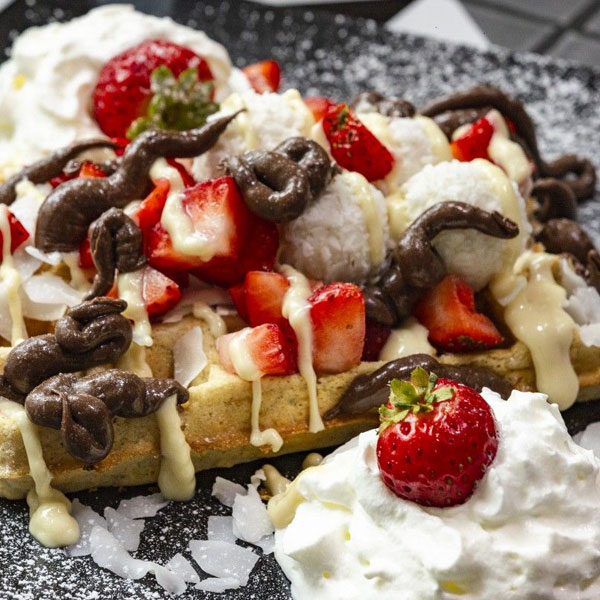 A fresh golden waffle drizzled in nutella spread with luxury ferrero rocher pieces and roasted nuts topped with a second helping of nutella sauce and served with scoop of kellys vanilla bean ice cream.