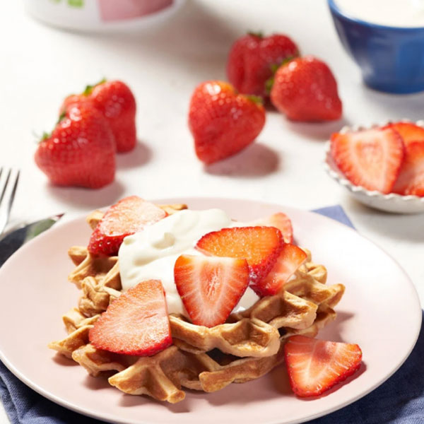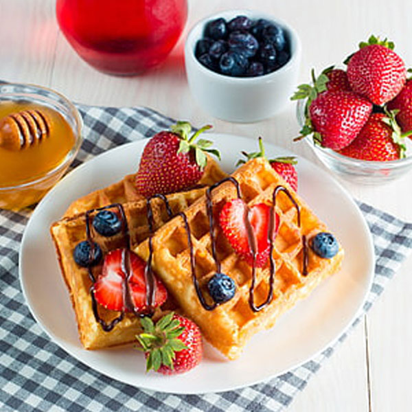 A fresh golden waffle drizzled with belgian chocolate sauce, served with strawberries, scoop of kellys ice cream and strawberry syrup.
