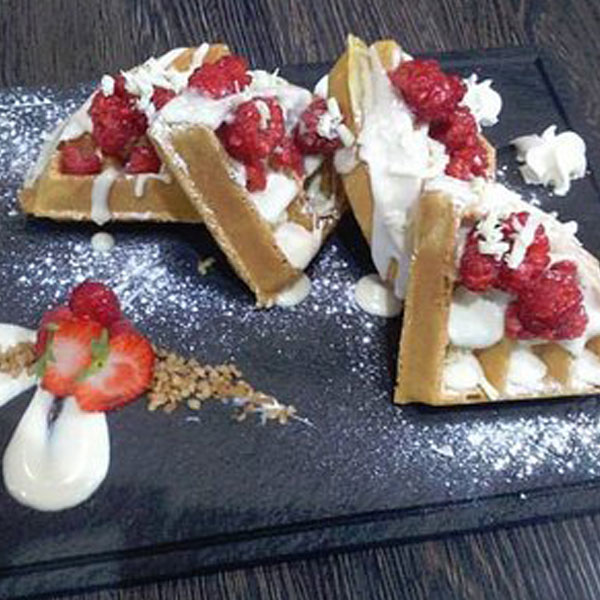 A fresh golden waffle topped with white chocolate sauce and pieces of luxury raffaello, coconut shavings served vanilla bean with a scoop of kellys ice cream.