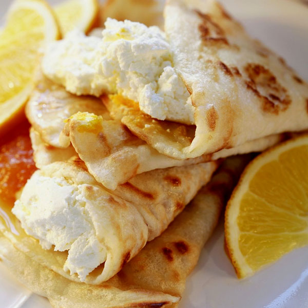 Crepe served with lemon and sugar with a scoop of kelly’s vanilla bean ice cream