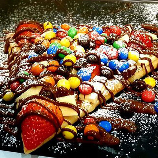 A fresh crepe drizzled with milk chocolate sauce topped with smarties and more smarties and finished with chocolate sauce with a scoop of kellys vanilla bean ice cream.