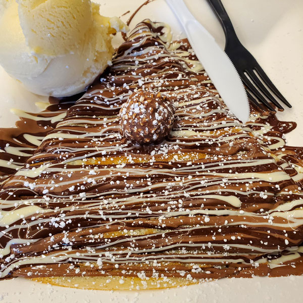 Crepe covered in nutella sauce sprinkled with ferrero pieces and roasted nuts topped with a second helping of nutella sauce and a scoop of kelly’s vanilla bean ice cream