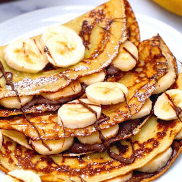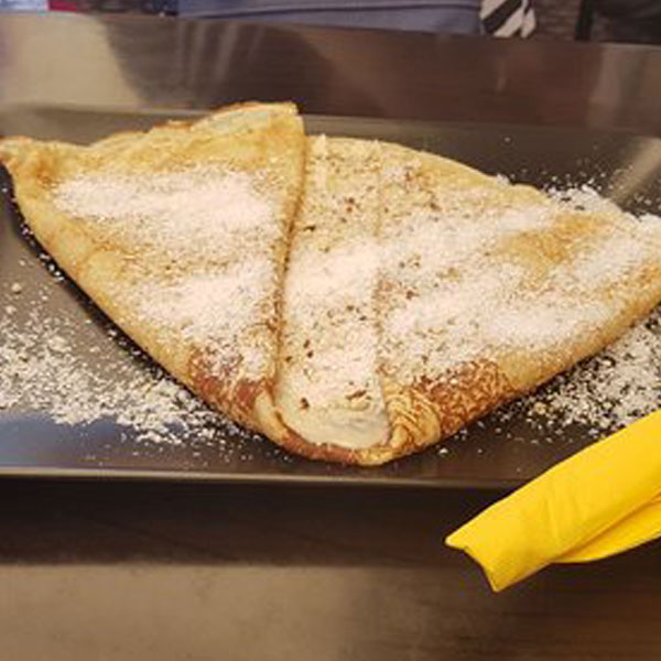Crepe covered in chocolate sauce topped with chopped banana’s and drizzled with white chocolate sauce served with a scoop of kelly’s vanilla bean ice cream.
