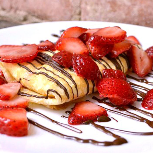 Crepe smothered in warm milk chocolate sauce topped with blueberries and strawberries served with a scoop of kelly’s vanilla bean ice cream