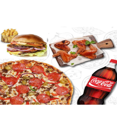 Any 15" Pizza, 4 Slices Of Garlic Bread, 1Portion Of Potato Wedges Or 6 Chicken Wings, 1 Bottle Of Soft Drink