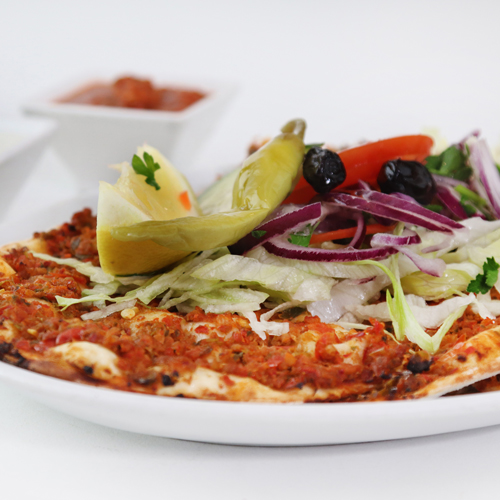 Very Thin Traditional Turkish Pizza Covered With The Seasoned Minces Lamb X Onion, Fresh Tomatoes, Parsley and Red Pepper