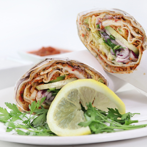 Specially prepared minced chicken with herbs & onions on skewers char-grilled, wrapped in a thin homemade bread topped with homemade tomato sauce