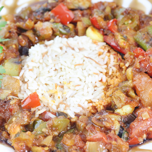 Cubes of aubergine, courgette, mushroom, char-grilled bell peppers