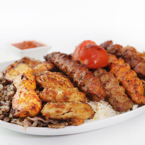 For 3 People To Share. Contains Lamb. Lamb Shish (1 Skewer), Adana (1 Skewer), Koubideh (2 Skewers), Lamb Shawarma (Complimentary).(served With Hummus, Jajik, Rice, Bulgur, Bowl Of Salad, Bread, Garlic & Chilli Sauce).