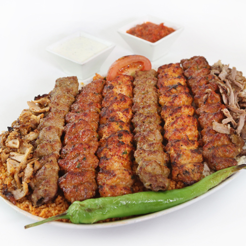 For 3 people to share. Contains minced meat & mixed doner. Lamb Shawarma, Chicken Shawarma, 2 Kofte, 2 Adana, 2 Beyti.(served with Hummus, jajik, Rice, Couscous, Bowl of Salad, Bread, Garlic & Chilli sauce).