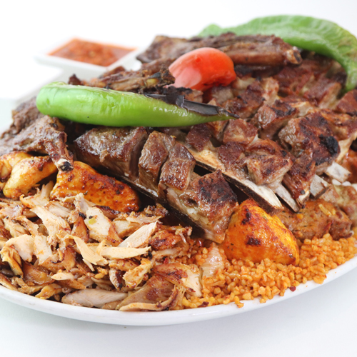 For 4-5 people to share. 4pcs Lamb Chops, 8pcs Lamb Ribs, 1 Lamb & 1 Chicken Shish, 1 Chicken beyti, 1 Adana Kofte, 8pcs Chicken Wings, 1 Koubideh Kebab, Mixed Shawarma. (served with Hummus, jajik, Rice, Couscous, Bowl of Salad, Bread, Garlic & Chilli sauce).